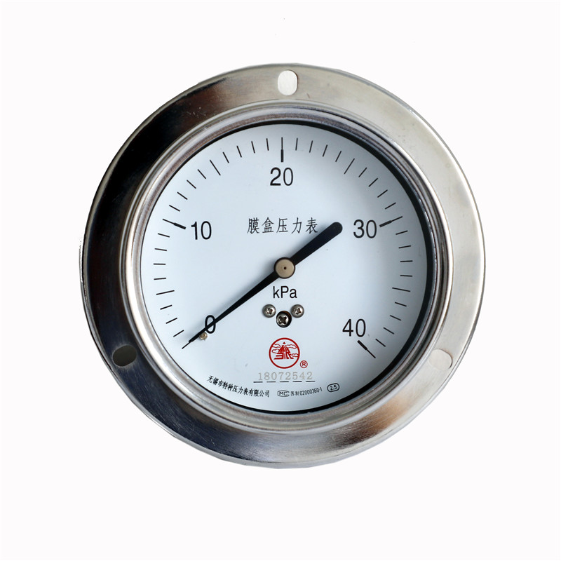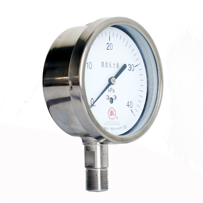 不銹鋼膜盒壓力表采用不銹鋼波紋膜盒作為測量微小壓力的敏感元件。不銹鋼膜盒壓力表適用于測量對不銹鋼不起腐蝕作用,無爆炸危險的氣體或液體的微小壓力。表盤上面有調零裝置,可以方便調整零位。不銹鋼膜盒壓力表廣泛應用于石油、化工、冶金等工業部門壓力測量,不銹鋼膜盒壓力表可以就地安裝并現場指示壓力。本公司可根據用戶需要,設計、制造特殊用途的不銹鋼膜盒壓力表產品,歡迎來人來電、來函洽談!