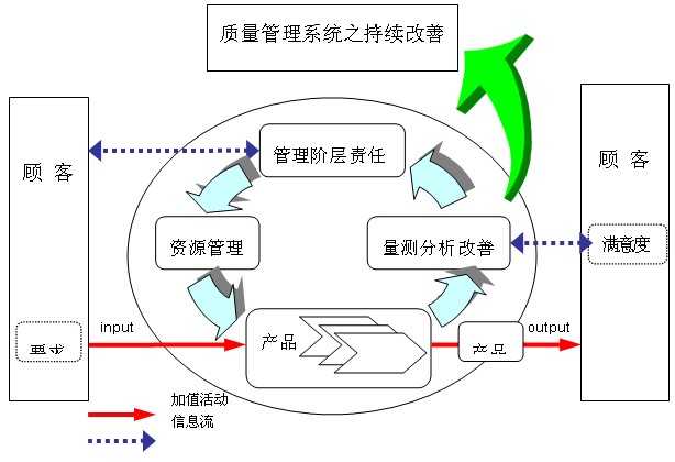 本模式要求定期審查本公司質量管理系統,必要時得修訂質量政策與目標。質量管理系統之運作模式如圖所示。