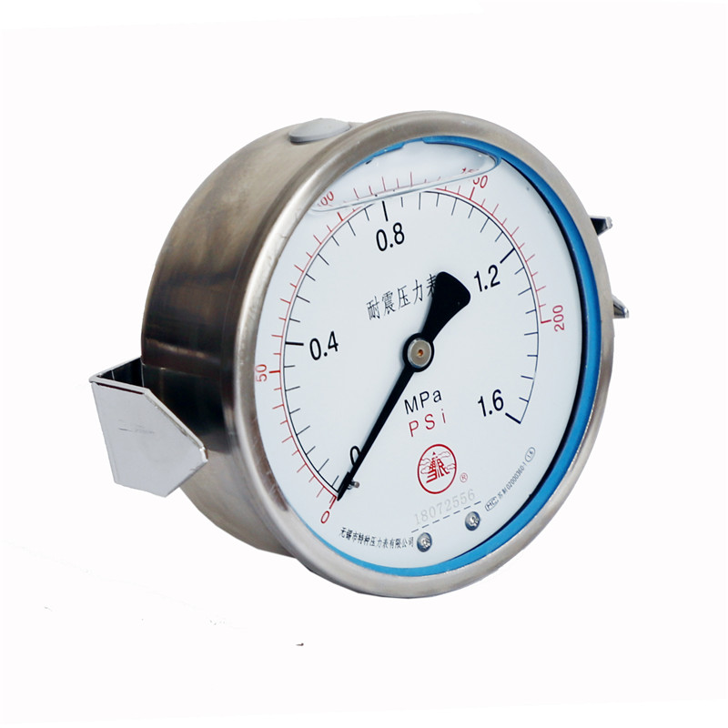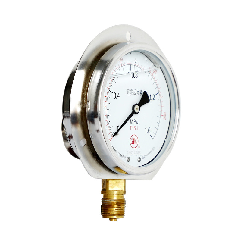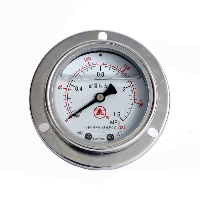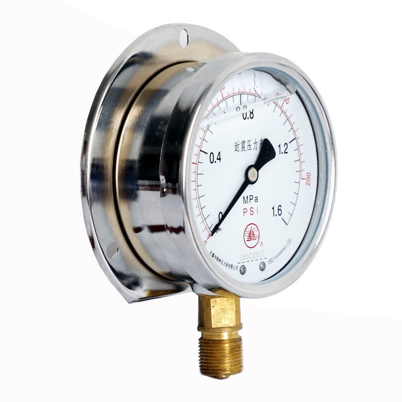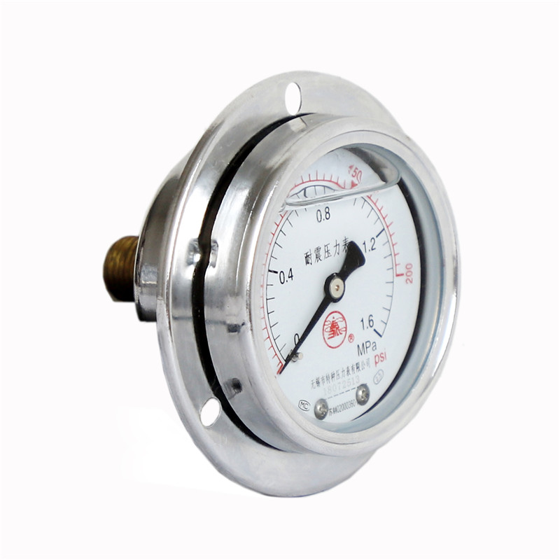 軸向帶邊耐震壓力表是在普通壓力表的基礎上,表殼為全密閉型結構,內部填充阻尼液(一般為甘油或者硅油)并加裝緩沖機構,減輕環境劇烈振動及介質脈沖對儀表示值的影響,軸向帶邊耐震壓力表利用自帶的圓形或者方型安裝盤固定在設備面板上,便于操作工人隨時觀察壓力變化。耐震型壓力表指示穩定清晰。廣泛應用于液壓機械、石油、化工、冶金、礦山機械、電力設備等部門,測量對銅和銅合金無腐蝕性介質的壓力。
