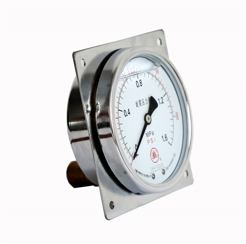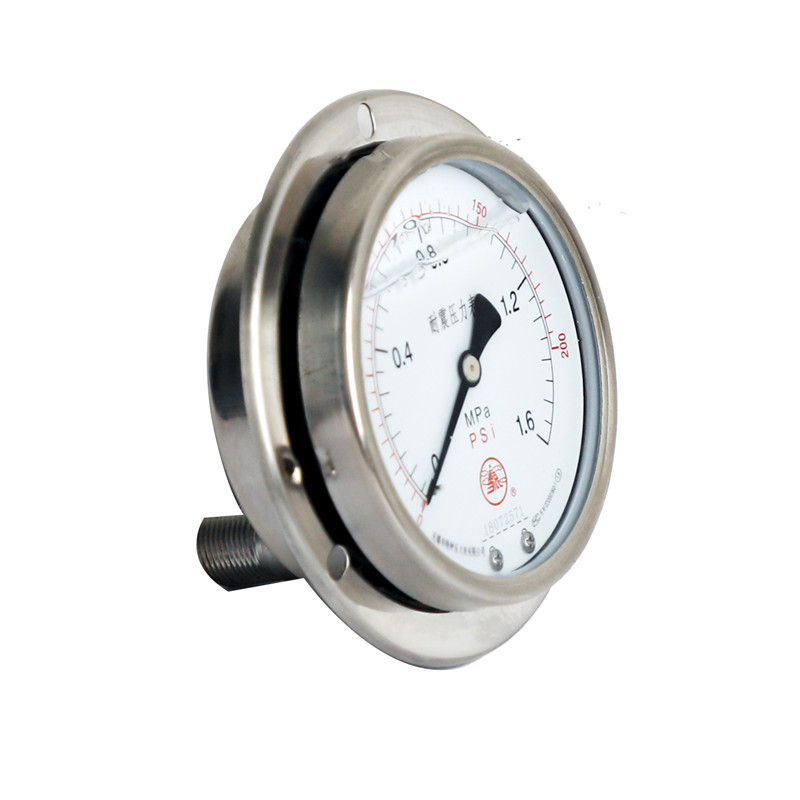 軸向前邊耐震壓力表是耐震壓力表系列中常用的一種,安裝時利用耐震壓力表自帶的安裝邊(盤)固定在設備面板上,方便操作人員隨時觀察壓力變化。軸向前邊耐震壓力表表殼為全密閉型結構,內部填充阻尼液(一般為甘油或者硅油)并加裝緩沖機構,減輕環境劇烈振動及介質脈沖對儀表示值的影響,耐震型壓力表指示穩定清晰。廣泛應用于液壓機械、石油、化工、冶金、礦山機械、電力設備等部門,測量對銅和銅合金無腐蝕性介質的壓力。使用壽命長,是普通壓力表的替代產品,防護等級IP65。